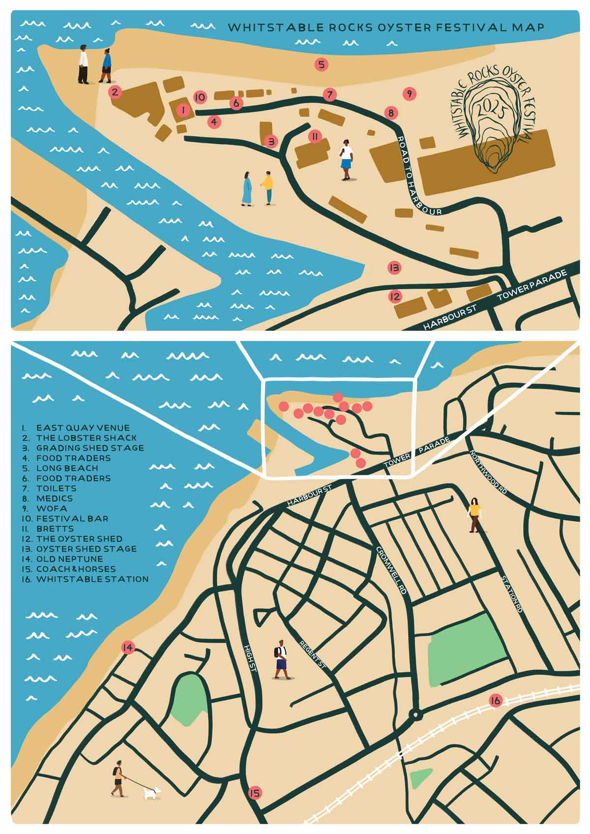 The main festival site is located on the East Quay of Whitstable Harbour, outside the Lobster Shack restaurant and East Quay venue. This area is free to attend. Here you will find The Grading Shed stage, food vendors, the festival bar and of course- oysters! The Oyster Shed stage is located in the main harbour.